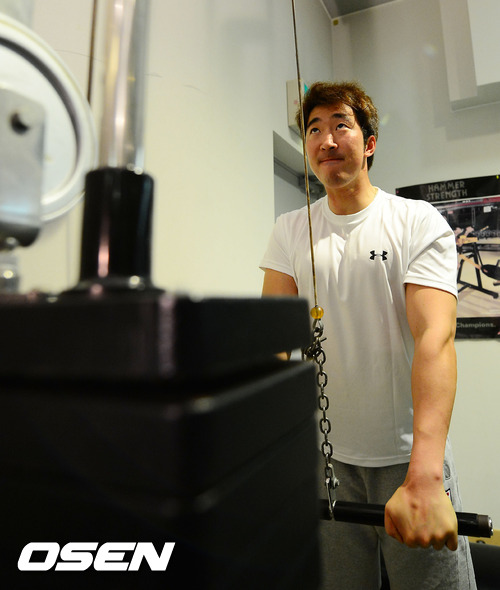 두산 오현근이 선수단 숙소 라구제 히토츠바의 웨이트장에서 훈련을 하고 있다.