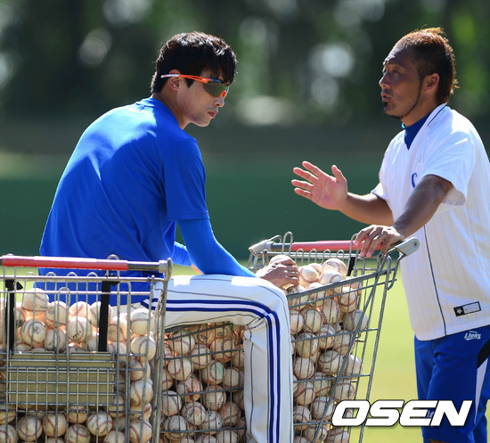 2일 오전(현지시간) 괌에 위치한 레오팔레스 삼성 1차 전지훈련장에서 강명구가 야구공이 담긴 쇼핑카트에 올라 타 코야마 코치와 이야기를 나누고 있다.