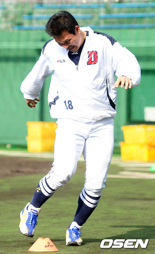 2일 일본 미야자키 기요다케 구장에서 진행된 두산 베어스 2013 미야자키 전지훈련에서 김동주가 장난으로 훈련용 콘을 걷어차고 있다.