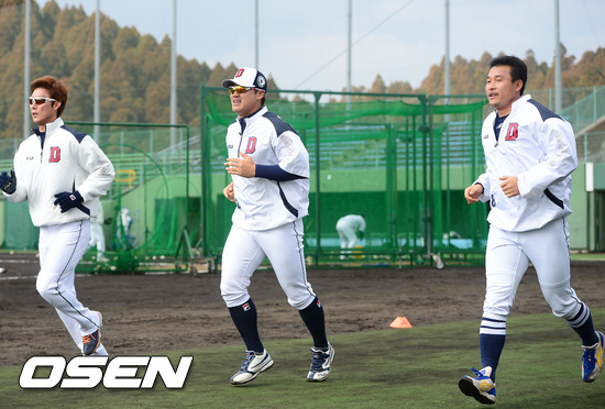 2일 일본 미야자키 기요다케 구장에서 진행된 두산 베어스 2013 미야자키 전지훈련에서 고영민 홍성흔 김동주가 러닝훈련을 하고 있다.