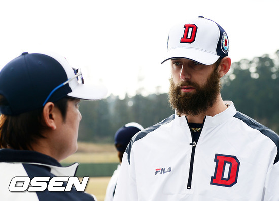 2일 일본 미야자키 기요다케 구장에서 진행된 두산 베어스 2013 미야자키 전지훈련에서 니퍼트가 김선우와 얘기를 나누고 있다.