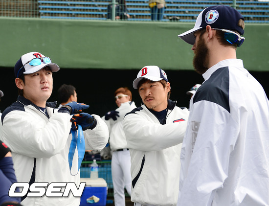 2일 일본 미야자키 기요다케 구장에서 진행된 두산 베어스 2013 미야자키 전지훈련에서 김선우가 니퍼트에게 사인을 알려주고 있다.