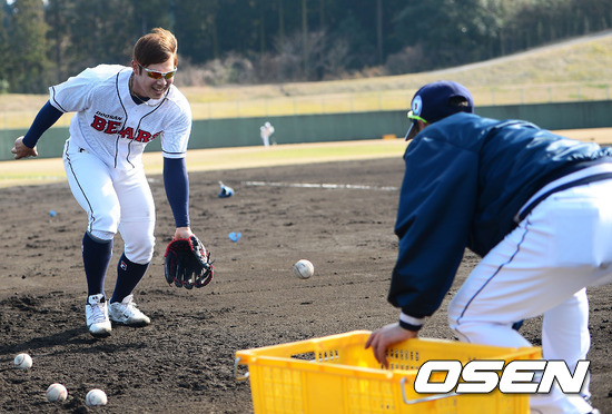 2일 일본 미야자키 기요다케 구장에서 진행된 두산 베어스 2013 미야자키 전지훈련에서 윤석민이 수비훈련을 하고 있다.