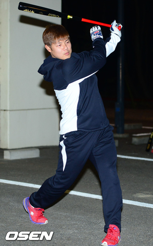 2일 일본 미야자키 기요다케 구장에서 진행된 두산 베어스 2013 미야자키 전지훈련을 마치고 윤석민이 선수단 숙소 라구제 히토츠바의 주차장에서 스윙 연습을 하고 있다.