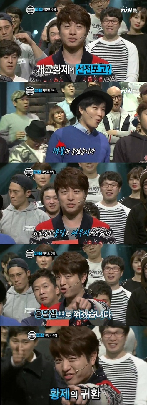 유상무는 지난 2일 방송된 '코미디 빅리그'에서 "다음 주 진정한 왕이 누군지 보여드리겠다"며 "다음 주는 옹달로 싸우지 않겠다. 개불을 옹달샘으로 꺾겠다"고 선전포고했다. 이어 "다음 주 유세윤과 함께 황제의 귀환"이라고 덧붙이며 자신감을 드러냈다.