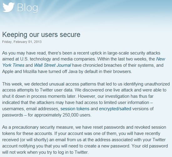 1일(현지시간) 트위터 이용자 정보 유출 해킹 시도가 있은 후 오후 5시가 채 되지 않아 밥 로드(Bob Lord) 트위터 정보 보안 디렉터는 트위터 블로그에 “이번 해킹은 아마추어의 실력이 아니며 우리에게만 일어난 단독 사건이 아니라고 본다”며 재빨리 해명의 글을 올렸다.