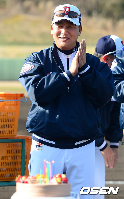 3일 일본 미야자키 기요다케 구장에서 진행되는 두산 베어스 2013 미야자키 전지훈련에서 훈련 전 금일 생일을 맞은(음력 12월 23일) 두산 김진욱 감독을 위해 선수들이 준비한 깜짝 생일 축하 이벤트가 마련되고 있다.