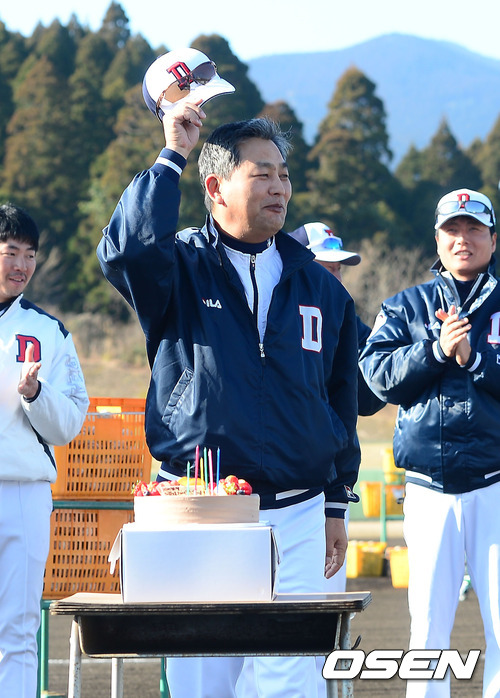3일 일본 미야자키 기요다케 구장에서 진행되는 두산 베어스 2013 미야자키 전지훈련에서 훈련 전 금일 생일을 맞은(음력 12월 23일) 두산 김진욱 감독을 위해 선수들이 준비한 깜짝 생일 축하 이벤트가 마련되고 있다. 김진욱 감독이 케이크의 촛불을 끈 후 인사를 하고 있다.