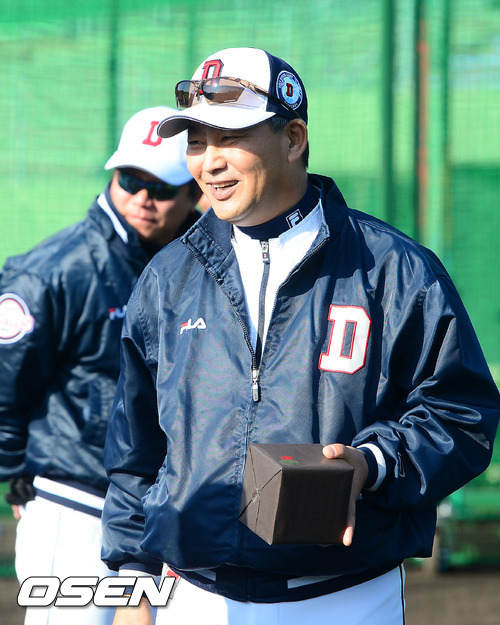 3일 일본 미야자키 기요다케 구장에서 진행되는 두산 베어스 2013 미야자키 전지훈련에서 훈련 전 금일 생일을 맞은(음력 12월 23일) 두산 김진욱 감독을 위해 선수들이 준비한 깜짝 생일 축하 이벤트가 마련되고 있다. 김진욱 감독이 선물을 들고 환하게 미소짓고 있다.