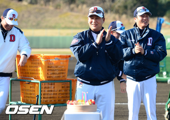 일본 미야자키에서 전지훈련에 한창인 김진욱 두산 베어스 감독이 선수단의 깜짝 생일 선물에 감동의 기색을 감추지 못했다.