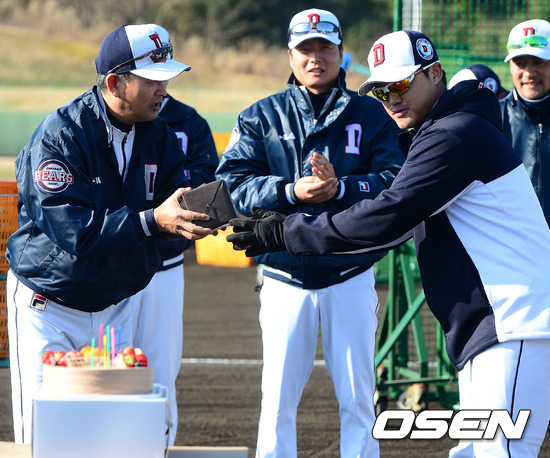 3일 일본 미야자키 기요다케 구장에서 진행되는 두산 베어스 2013 미야자키 전지훈련에서 훈련 전 금일 생일을 맞은 두산 김진욱 감독을 위해 선수들이 준비한 깜짝 생일 축하 이벤트가 마련되고 있다.