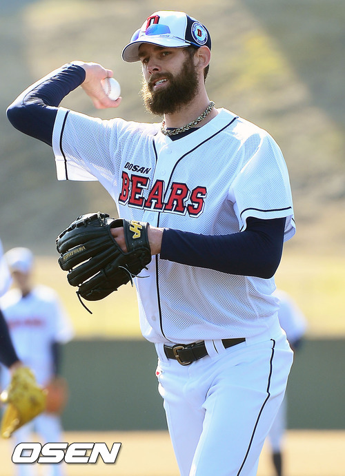 3일 일본 미야자키 기요다케 구장에서 진행되는 두산 베어스 2013 미야자키 전지훈련에서 두산 니퍼트가 수비 훈련을 하고 있다.