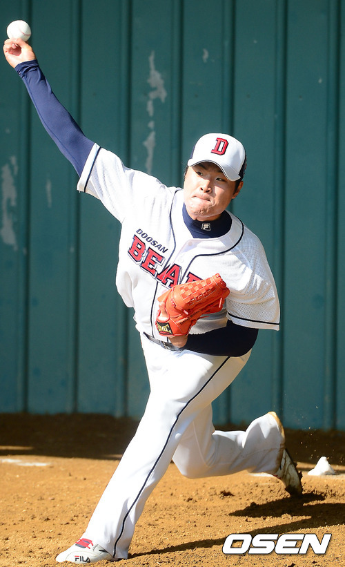 3일 일본 미야자키 기요다케 구장에서 진행되는 두산 베어스 2013 미야자키 전지훈련에서 두산 서동환이 힘차게 공을 뿌리고 있다.