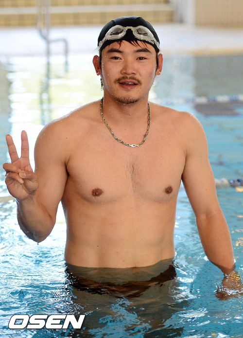 3일 일본 미야자키 기요다케 구장에서 진행된 두산 베어스 2013 미야자키 전지훈련을 마치고 노경은이 선수단 숙소 라구제 히토츠바의 수영장에서 포즈를 취하고 있다.