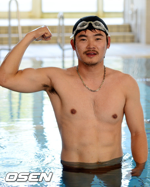 3일 일본 미야자키 기요다케 구장에서 진행된 두산 베어스 2013 미야자키 전지훈련을 마치고 노경은이 선수단 숙소 라구제 히토츠바의 수영장에서 포즈를 취하고 있다.