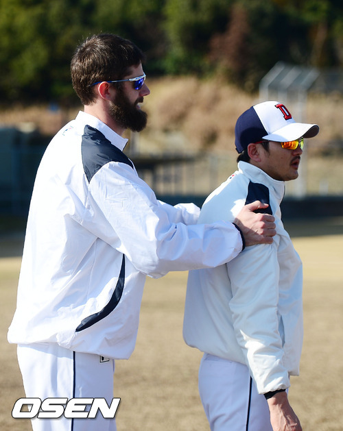 3일 일본 미야자키 기요다케 구장에서 진행된 두산 베어스 2013 미야자키 전지훈련을 마치고 니퍼트가 이재우의 어깨를 주물러주고 있다.