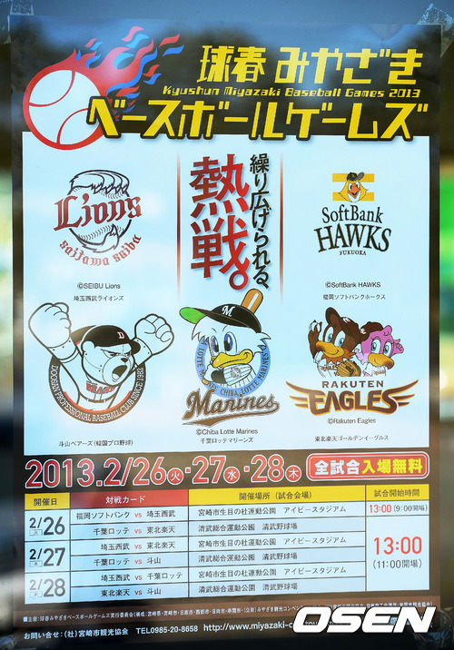 3일 일본 미야자키 기요다케 구장에서 진행되는 두산 베어스 2013 미야자키 전지훈련에서 두산 베어스와 일본 팀과의 연습경기가 예고된 포스터가 붙어있다.