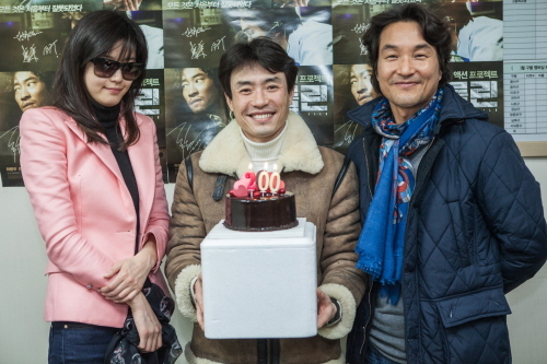 200만명을 돌파한 자축 인증샷에는 전지현, 류승완 감독, 한석규가 200이라는 숫자의 초가 꽂혀진 케익을 앞에 두고 미소를 짓고 있다.