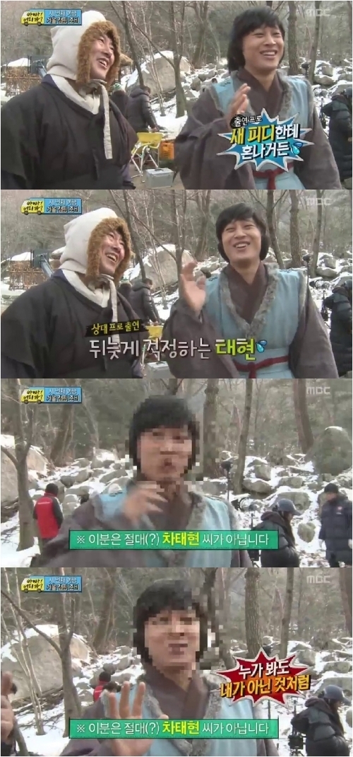 차태현은 “나 여기 나가면 ‘1박2일’ 빠지나? 우린 만날 야외취침”이라고 불평을 했다. 이어 그는 “모자이크 처리해달라. (경쟁 프로그램 나갔다고) 새PD(최재형 PD)한테 혼난다”고 말해 웃음을 자아냈다. 결국 제작진은 차태현의 얼굴을 모자이크 처리해서 내보냈지만, 누가 봐도 차태현으로 보여 웃음을 줬다.