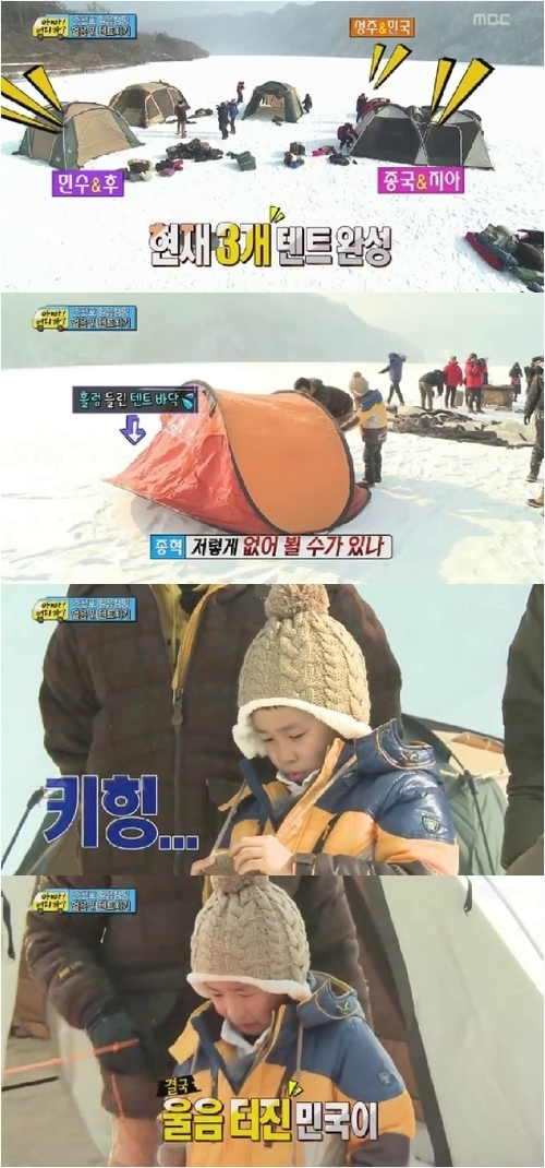 한편 ‘아빠 어디가’는 아빠와 자녀가 오지로 떠나는 여행기를 담은 리얼 버라이어티 프로그램으로 성동일·성준, 김성주·김민국, 이종혁·이준수, 송종국·송지아, 윤민수·윤후 등이 출연한다. 스타와 스타 자녀들은 세 번째 여행으로 강원도 춘천 원평호로 겨울 캠핑을 떠났다.