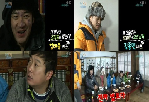3일 방송된 KBS 2TV 주말 버라이어티 ‘해피선데이-1박2일’ 겨울방학 특집에서는 잠든 사이 가장 많은 도장을 받은 엄태웅과 김종민이 아침 식사 당번으로 당첨, 멤버들을 위해 아침 식사를 준비하는 모습이 그려졌다.