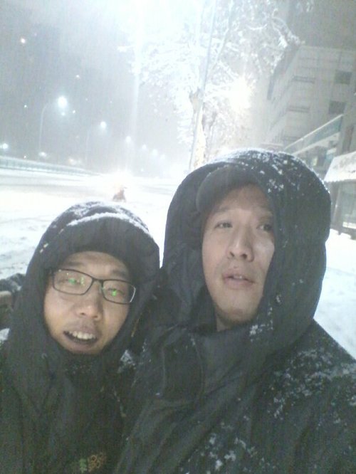공개된 사진에는 모자를 푹 뒤집어 쓴 채 내리는 눈을 맞고 있는 정준하와 김제동의 모습이 담겨있다. 이들은 마치 형제처럼 다정히 어깨를 맞대고 친분을 과시하고 있다.