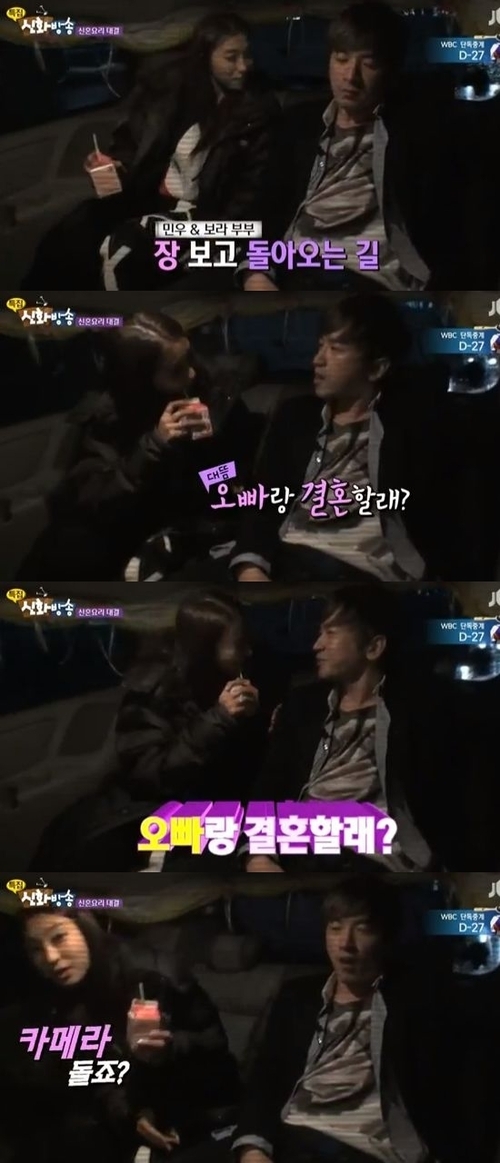 이날 방송에서 이민우와 보라는 특별히 준비된 웨딩카를 타고 요리대결을 위한 장보기에 나섰다. 장을 보고 돌아오는 차 안에서 보라는 이민우에게 “오빠가 올해 몇 살인가? 34살?”이라고 물었고 이에 이민우는 “오빠랑 결혼할래?”라며 뜬금없지만 낭만적인 프로포즈를 했다.