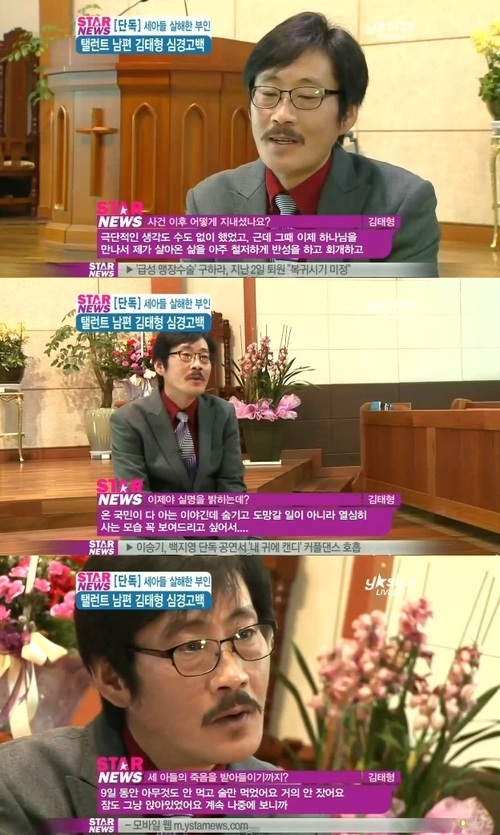 미국에 살고 있는 여동생 집에 다녀온 후 겨우 마음을 추스렀다는 김태형은 "그동안 일부러 정신적으로 육체적으로 혹사했다"며 "슬픔의 눈물을 흘리지 않겠다고 독하게 마음 먹었다. 천국에 가서 우리 아이들을 꼭 만나야겠다는 소망이 생겼다"고 덧붙였다.