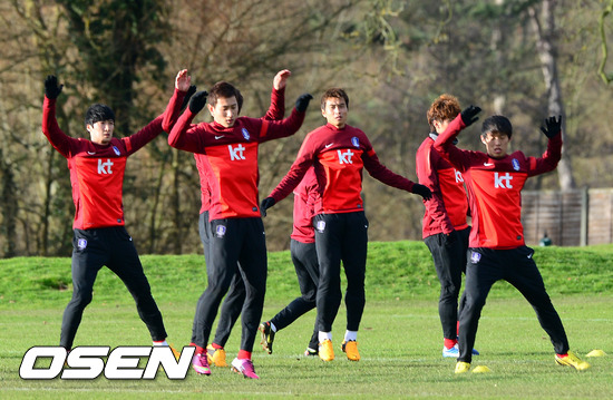 6일 런던 크레이븐 코티지에서 벌어질 크로아티아와 A매치에 출전할 태극전사들이 4일 늦은밤(한국시간) 말로우 비샴 애비 스포츠센터에서 바람이 강하게 부는 쌀쌀한 날씨에도 불구 강도 높은 훈련을 가졌다.
