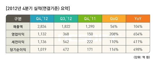 연간실적으로는 매출 7535억 원(연간 최대 매출), 영업이익 1513억원, 당기 순이익 1537억 원을 달성했다. 2011년에 비해 매출 24%, 영업이익 11%, 당기순이익 31%의 실적 상승을 기록했다.