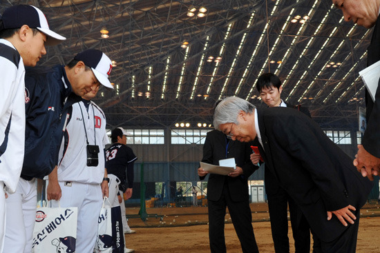 두산 베어스의 전지훈련 캠프가 차려진 미야쟈키 시의 아부미 카즈토시 부시장이 방문해 특산물인 소고기를 전달하며 건승을 바랐다.