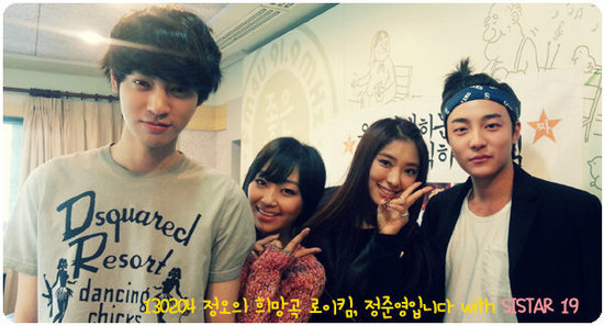 지난 4일 MBC FM4U '정오의 희망곡 김신영입니다'에 출연한 씨스타19는 몸이 좋지 않아 잠시 휴식기를 갖고 있는 김신영을 대신해 대타DJ로 활약하고 있는 정준영, 로이킴과 함께 사진을 찍었다.