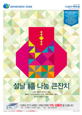 디큐브시티 내 디큐브백화점은 설 당일 오후 1시부터 영업하며 ‘설날 복 나눔 큰 잔치’를 실시해 아직 설 선물을 구입하지 못한 소비자나 설 연휴를 맞아 쇼핑하는 이들을 위해 각종 기획전을 제공한다. 또한 구매 금액 및 횟수에 따라 디큐브백화점 상품권 및 경품을 제공하는 ‘설 맞이 스탬프 大잔치’도 동시에 진행된다.