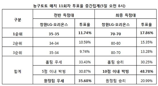 국민체육진흥공단(www.kspo.or.kr)이 발행하는 체육진흥투표권 수탁사업자 스포츠토토의 공식 온라인 발매사이트인 베트맨(www.betman.co.kr)이 6일 오후 7시 창원실내체육관에서 열리는 LG-오리온스전을 대상으로 한 농구토토 매치 11회차 투표율을 중간 집계한 결과, 전체 참가자의 절반에 가까운 48.78%가 양팀의 10점 이내 박빙승부를 예상했다고 전했다.