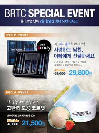 뿐만 아니라 다가오는 밸런타인데이를 맞아 BRTC의 파워 옴므세트를 CJ 올리브영 전 매장에서 43% 할인된 가격으로 선보일 예정이라고 관계자는 전했다. 이 밖에도 CJ 올리브영에 입점돼 있는 모공 수축 임상을 완료한 BRTC의 ‘오버나이트 포어타이트너’를 2월 한달 간 50% 할인된 가격으로 선보일 계획이다.