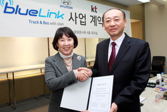 KT와 현대차는 4일 서울 광화문 KT 사옥에서 임수경 KT G&E부문 운영총괄 전무와 곽우영 현대자동차 차량IT서비스사업부 부사장 등 양사 관계자들이 참석한 가운데 ‘블루링크 트럭 & 버스 with올레’ 사업 계약을 체결하고, 국내 최초로 대형트럭의 스마트카 사업을 추진한다고 5일 밝혔다.