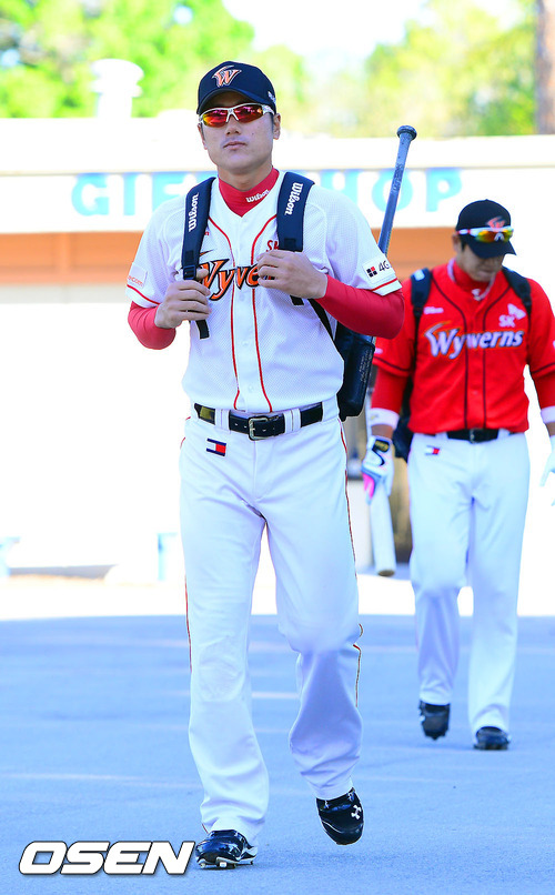 SK 박정권이 아침훈련을 위해 구장으로 이동하고 있다