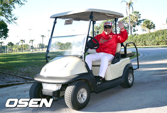 SK 이만수 감독이 아침훈련을 위해 구장으로 이동하며 취재진을 향해 포즈를 취하고 잇다