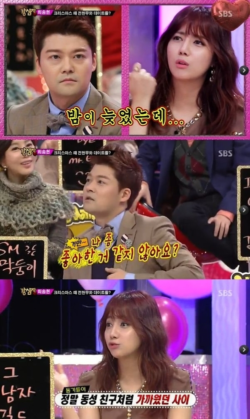 최송현은 지난 5일 방송된 SBS '강심장'에 출연해 "KBS 신입 아나운서 시절 나는 경남 창원, 전현무는 대구로 발령이 났다. 크리스마스 때 할 일이 없어서 기차 타고 대구로 전현무를 만나러 갔다"라고 말문을 열었다.