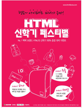 첫 번째는 신학기를 맞은 학생들을 위해 2월 4일부터 3월 10일까지 총 35일간 ‘HTML 신학기 페스티벌’을 진행한다. 에이치티엠엘(HTML)의 온 ·오프라인 매장에서 제품을 구매한 소비자 중 추첨을 통해 아이패드 미니, 아이팟 셔플, 크리미어 패딩 조끼 등 다양한 상품을 증정하며, 모든 구매 소비자에게는 자체 제작한 파우치를 증정한다.