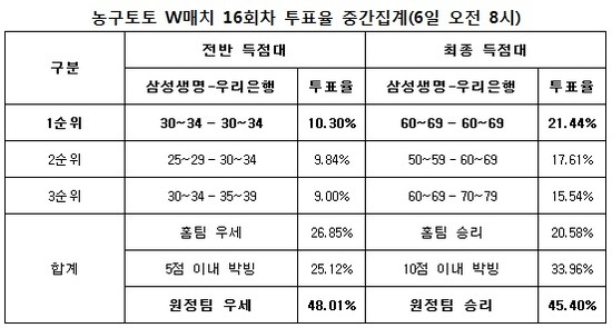 [농구토토] 국민체육진흥공단(www.kspo.or.kr)이 발행하는 체육진흥투표권 수탁사업자인 스포츠토토 공식 온라인 발매사이트인 베트맨(www.betman.co.kr)이 오는 7일 오후 5시 용인실내체육관에서 벌어지는 삼성생명-우리은행 전 대상 농구토토 W매치 16회차 투표율을 중간 집계한 결과, 참가자의 45.40%는 선두 우리은행이 3위 삼성생명에 승리를 거둘 것으로 예상했다고 밝혔다.