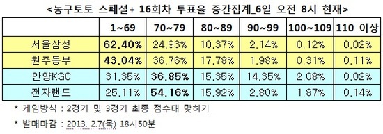 [농구토토] 국민체육진흥공단(www.kspo.or.kr)이 발행하는 체육진흥투표권 수탁사업자인 스포츠토토 공식 온라인 발매 사이트인 베트맨(www.betman.co.kr)은 7일에 펼쳐지는 서울삼성-원주동부(1경기), 안양KGC-인천전자랜드(2경기)전 등 한국프로농구(KBL) 2경기를 대상으로 한 농구토토 스페셜+ 16회차 투표율 중간집계 결과, 삼성-동부전에서 양팀의 박빙승부를 전망한 참가자가 많은 것으로 나타났다.