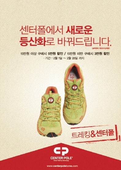 센터폴 매장에 브랜드에 상관없이 헌 등산화를 가져오면 새 제품 구매시 총 구매 금액이 15만원 이상일 경우 5만원, 15만원 미만일 경우는 3만원이 할인된 가격으로 구입할 수 있다. 단, 일부 제품과 수입 제품은 행사 품목에서 제외된다.