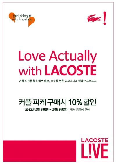 이번에 진행되는 ‘Love Actually with LACOSTE L!VE’ 프로모션은 밸런타인데이를 맞아 라코스테 라이브가 준비한 행사로, 커플 피케 아이템 구매 시, 10% 할인해준다. 이번 이벤트는 라코스테 라이브 전국매장 및 E-shop에서 진행된다.