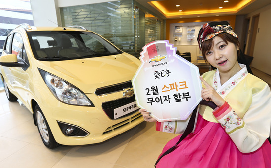 먼저 스파크 구매자 대상으로 2월 한달 동안 무이자할부(선수율 10%-12개월 무이자, 선수율 20%-24개월 무이자, 선수율30%-36개월 무이자)와 12347할부 (선수금 10만 원에 1%-12개월, 2%-24개월, 3%-36개월, 4%-48개월, 7%-60개월)를 실시한다.