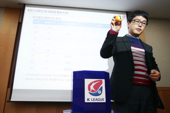 한국프로축구연맹(총재대행 김정남)은 6일 오후 서울 종로구 신문로 축구회관에서 K리그 8팀 관계자가 참석한 가운데 ‘2013 K리그’ 대진 추첨을 진행했다. K리그는 오는 3월 16일 개막해 11월 30일 마친다. 팀당 35경기씩 총 140경기를 치른다. 홈경기는 팀별로 17~18경기가 열린다.