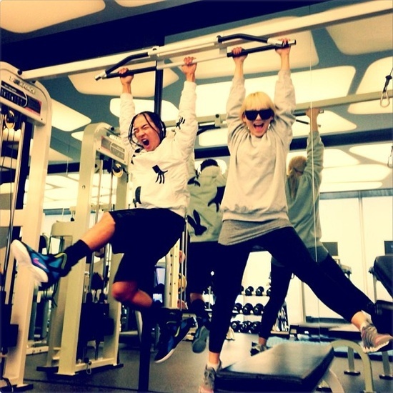 그룹 빅뱅의 태양과 2NE1의 씨엘이 함께 운동 기구에 매달린 채 사진을 찍었다.
