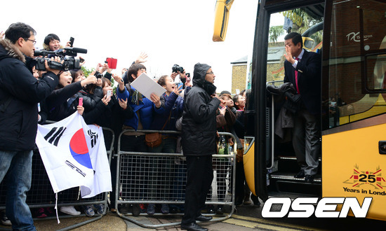 최강희 감독이 교민들의 환호를 받으며 버스에서 내리고 있다.