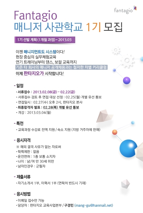 ‘매니저 사관학교’ 1기 모집은 이달 말 최종 합격자가 발표되면 3월 4일, 월요일부터 개강해 본격적인 교육에 들어갈 예정이다. 최종 합격자에게는 '매니저 사관학교'의 수강료를 전액지원하고 지방 거주자에 한해 숙소지원도 이루어진다. 지원 방법을 비롯한 보다 자세한 내용은 판타지오 공식 홈페이지 (http://fantagio.kr)에서 확인 할 수 있다.