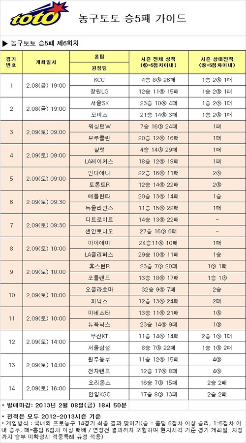 한편 서울SK-모비스(2경기) 전에서는 참가자들의 51.14%가 양 팀의 5점차 이내 박빙승부를 예상했으며, 부산KT-서울삼성(11경기)전에서는 71.45%가 부산KT가 서울삼성에 6점차 이상으로 승리할 것으로 전망했다. 한편 농구토토 승5패 6회차 게임은 8일 오후 6시 50분에 발매가 마감된다.